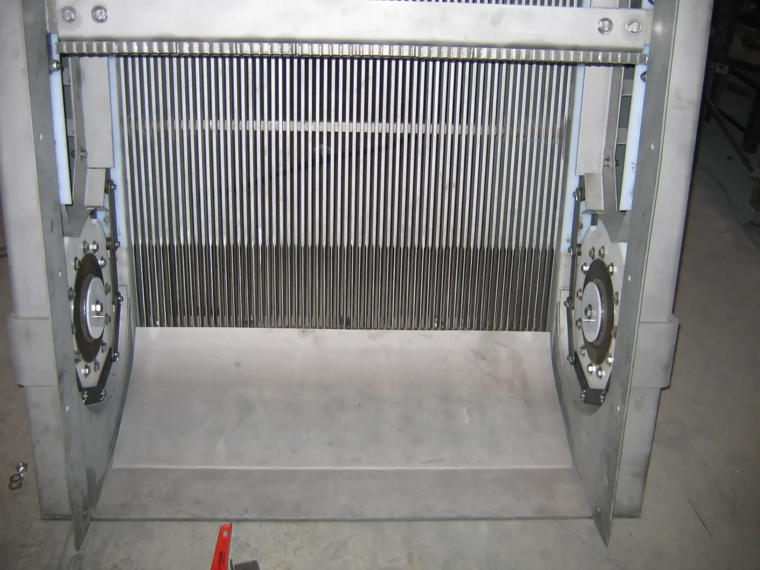 As influent flow passes through the stainless-steel bar rack assembly, debris is captured and elevated to the discharge point by rotating chains with multiple cleaning rakes. Discharged debris can be captured in screening bins, belt-conveyors, screw compactors or screw transfer conveyors.